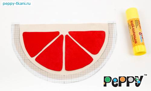 5. Из утеплителя «Warmtex», арт.: INSUL- BRIGHT 45 выкроим три основных детали (лицевая сторона, задняя сторона и донышко). Для лицевой стороны выкроим из утеплителя единую деталь, равную по размерам задней стороне. Поместим на нее детали «сердцевинки» и «корочки», а детали «дольки» выложим поверх «сердцевинки». Все детали из утеплителя должны выступать из ткани по всем сторонам на 5 миллиметров.