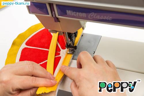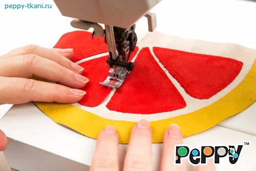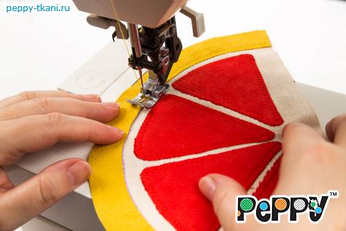 7. По контуру каждой детали аппликации проложим на швейной машинке «Micron» Classic 1035 декоративную строчку «зиг-заг», подобрав нитки «Gamma», арт.: 40/2 в тон ткани: для корочки цвет ниток №139 т.золотистый, для долек - №116 т.красный)