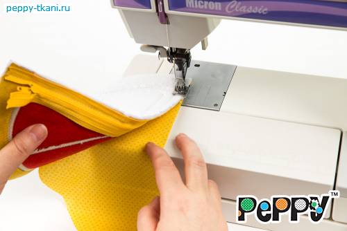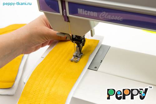 11. Прямоугольные детали «донышка» из ткани и утеплителя простегаем вместе вдоль, сделав между строчками расстояние, равное ширине лапки.