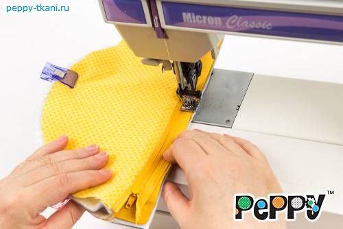 13. Приложим одну часть молнии «BLITZ», арт.: G003P лицом к лицу по краю лицевой части косметички и втачаем ее с припуском на шов 5мм. Для втачивания молнии воспользуемся специальной лапкой, которая входит в комплект к швейной машине Micron. Молнию предварительно расстегнем.