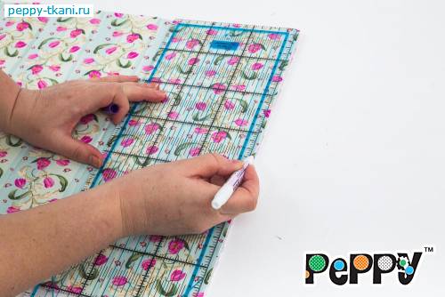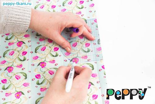 8. Приложим выкройку выреза к каждой короткой стороне и помощью самоисчезающего маркера «Gamma», арт.: MKR-001 переведем ее контур на ткань.