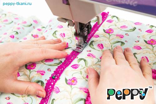 14. Отступив на внешней заготовке от края 15 сантиметров, настрочим малиновое кружево «Gamma», арт.: HVK-06.