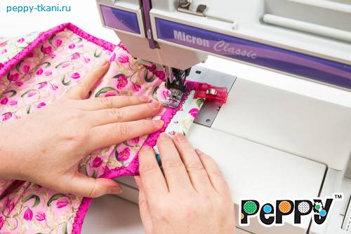 19. Проложим строчку вдоль короткой стороны, не доходя до угла 5 миллиметров. Развернем изделие на 90 градусов. Сделаем строчку назад, включив задний ход.