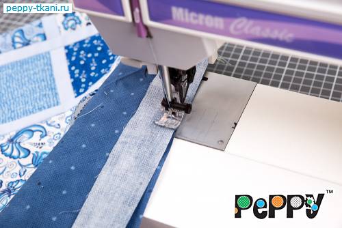 2. Складываем квадраты и маленькие разделительные полосы лицевыми сторонами. Сшиваем их. Для работы используем нитки GAMMA 200 я (№286 св.синий, №289 синий) и бытовую швейную машину Micron Classic (арт. 1035).