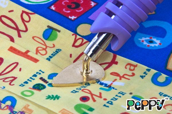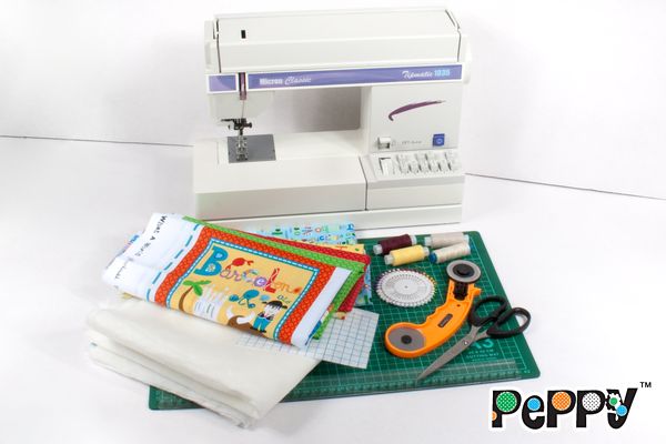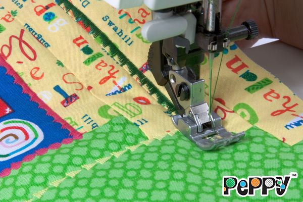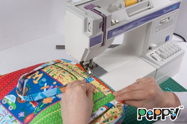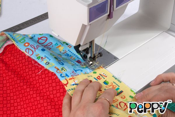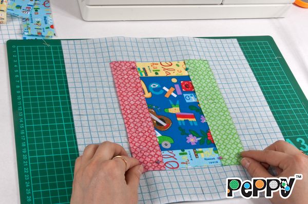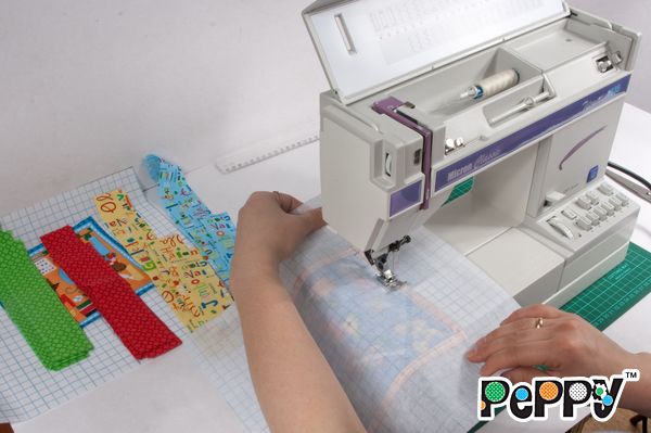 4. Следующими на полученную заготовку по краям, слева и справа, накладываем полосы цвета C и D размером 4 х 20 см лицевыми сторонами вниз, закалываем булавками. Переворачиваем заготовку и на швейной машине «Micron classic» прошиваем строго по размеченным линиям, отступив от края 1 см. «Micron classic» особенно удобна при работе в технике пэчворк, т.к. строчки получаются гладкими и незаметными. Снимаем булавки и проутюживаем швы с лицевой стороны, используя термоаппликатор «Micron». Пришиваем оставшиеся полосы в той же последовательности.