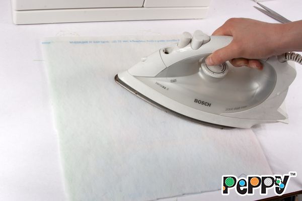 6. Флизелином H 640 проклеиваем основные детали сумки. Клеевую сторону прикладываем к изнаночной стороне детали. Шаг за шагом хорошо придавливаем заготовку утюгом при t до 130 °С в течение 15 секунд, можно использовать влажную салфетку.