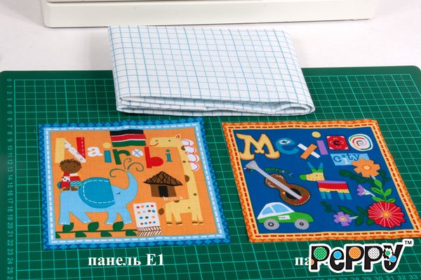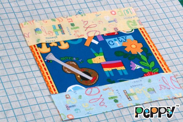 3. На изнаночной стороне флизелина расположите панель E2 лицевой стороной вверх точно по центру. Затем на панель Е по краям, сверху и снизу, накладываем полосы цвета А и В, размером 4 х 16 см лицевыми сторонами вниз, закалываем булавками. Переворачиваем заготовку и на швейной машинке «Micron classic» прошиваем строго по размеченным линиям, отступив от края 1 см. Снимаем булавки и проутюживаем швы с лицевой стороны, используя термоаппликатор «Micron» с насадкой «утюжок».