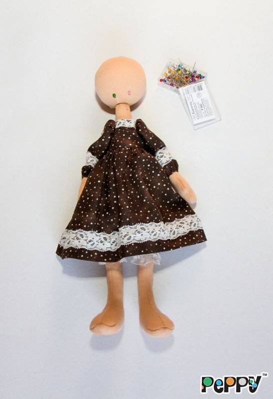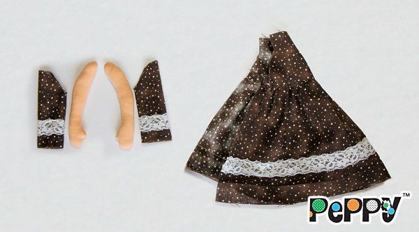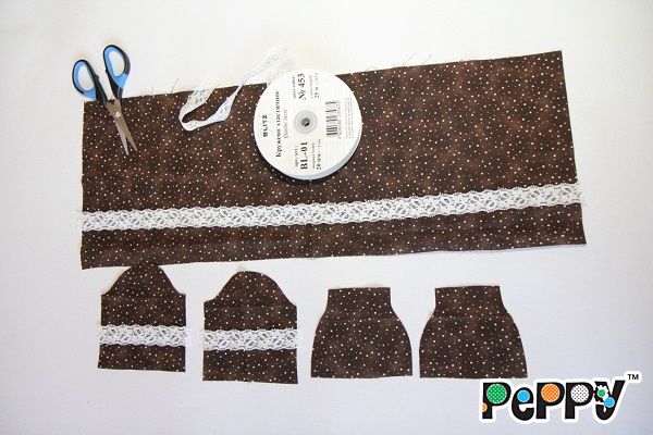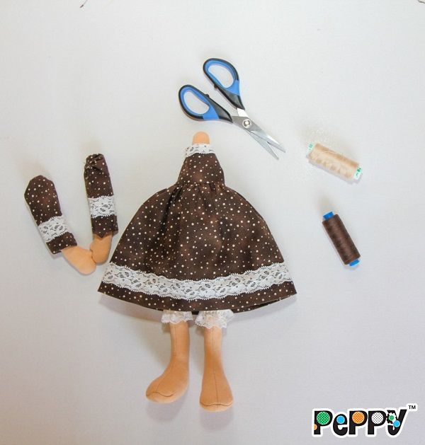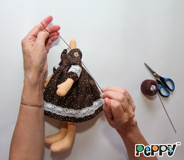 7. Заготовленные рукава платья (инструкция №3) присобрать по окату, надеть на ручки и закрепить стежками с помощью нитки 40/2 Gamma 100% полиэстер, цвет №488 коричневый.