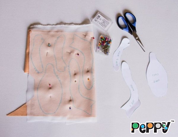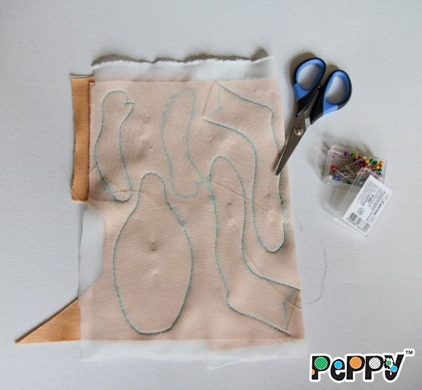 3. Обвести маркером Gamma RA-001 детали, скрепить булавками для закалывания Gamma Р-002 и прошить на швейной машине Micron Classic 1035, оставив незашитыми отверстия отмеченные пунктиром. Вырезать детали, оставляя на припуск 4-5 мм.
