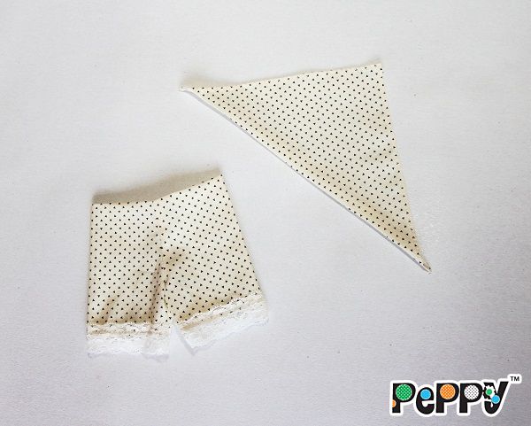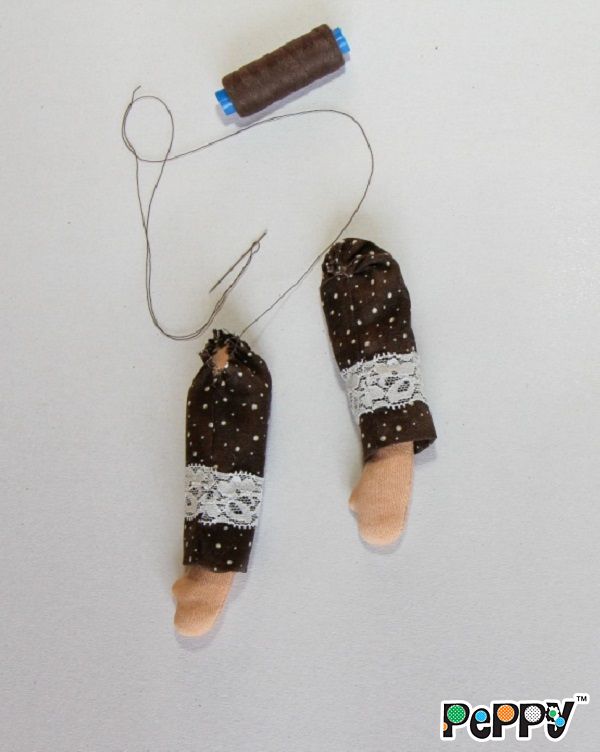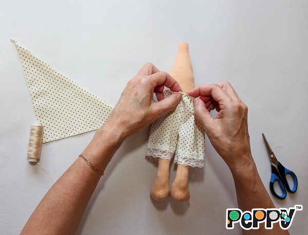 6. Надеть предварительно заготовленные штанишки (см. инструкцию №2, ниже) и пришить их к тельцу и ножкам потайным стежком с помощью ниток 40/2 Gamma 100% полиэстер, цвет №126 кремовый.