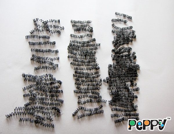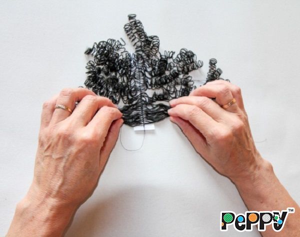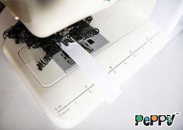 2. Разложить их равномерно поперек полоски бумаги шириной 2 см, (длина равна диаметру окружности головы) и прошить на швейной машине. Следить, чтобы волосы были одинаковой длины по обе стороны от бумажной полоски.