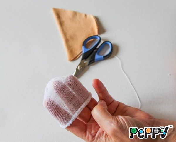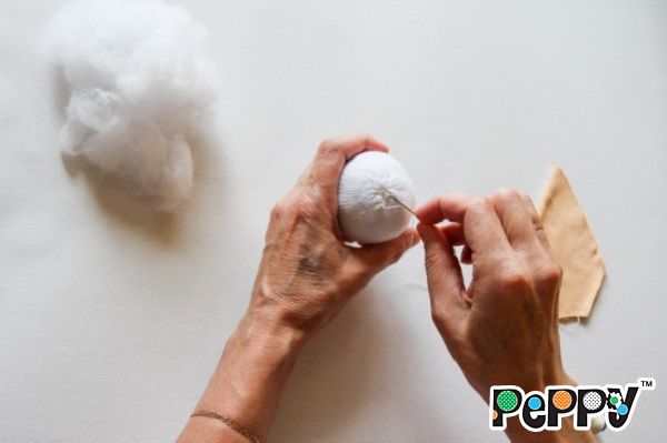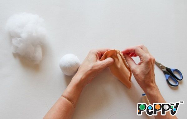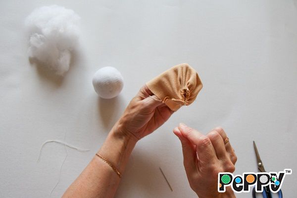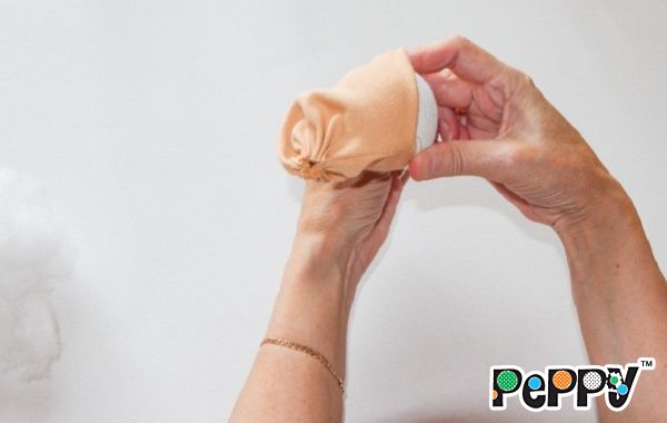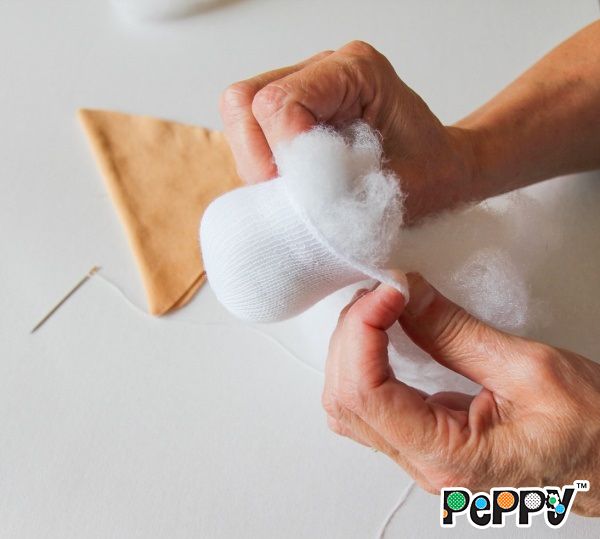 3. Вывернуть чулок на лицо, набить синтепухом Gamma (не очень плотно). Затем присборить открытый срез, стянуть ниткой, оставив небольшое отверстие, и продолжить набивать равномерно до хорошей плотности. Отверстие зашить.