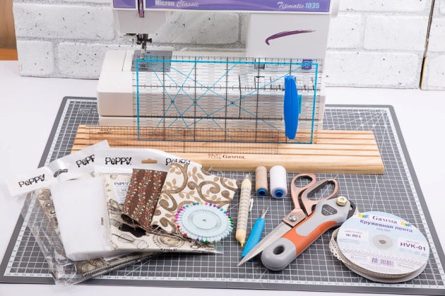 1. С помощью раскройного ножа «GAMMA» и линейки для пэчворка «GAMMA» выкраиваем детали кармана – 2 прямоугольника из ткани и один из флизелина размером 41х21 см. Вращающееся лезвие ножа «GAMMA» обеспечивает очень точный раскрой ткани. Для предохранения поверхности стола пользуемся складным матом для кроя «GAMMA». Мат  снабжен как обычной, так и диагональной разметкой, что позволяет моделировать детали необходимой формы и размера. Во время кроя удобно пользоваться держателем для линеек «GAMMA», который обеспечивает безопасность ваших рук.