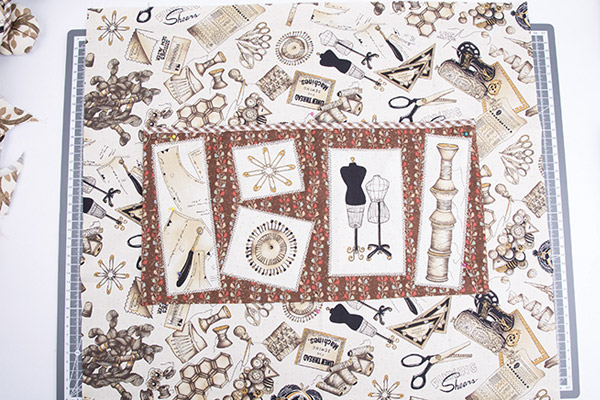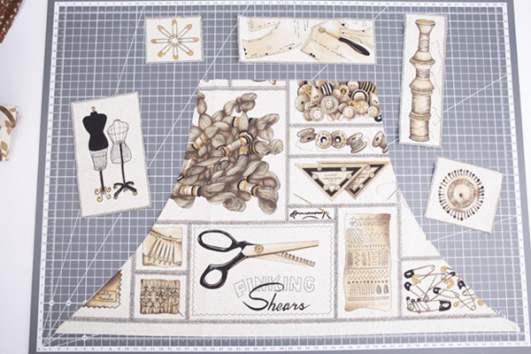 6. Выкраиваем детали аппликации для кармана с помощью роликового ножа «GAMMA» и линейки с металлическим краем «GAMMA». Металлический край предохраняет линейку от повреждений во время работы с ножом. Размечаем месторасположение элементов аппликации с помощью булавок.