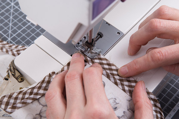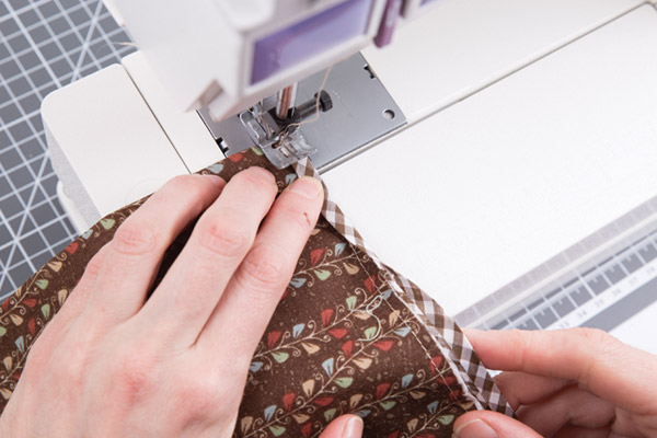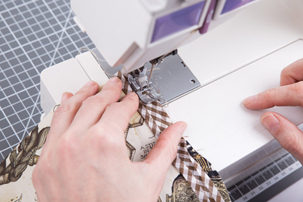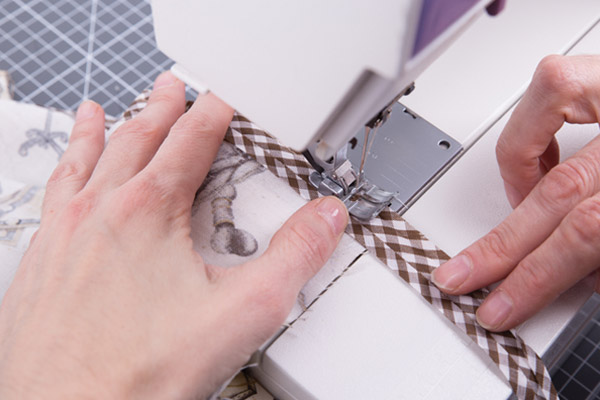 3. Выворачиваем карман и проутюживаем. Верхний срез кармана обрабатываем хлопковой косой бейкой «GAMMA». Для этого разворачиваем косую бейку и притачиваем её к изнаночной стороне кармана. Использование косой бейки удобно тем, что позволяет сразу оформить края изделия и выполнить завязки необходимой длины.