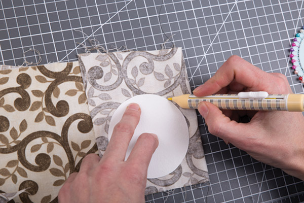 16. Переводим детали игольницы на сложенную пополам ткань с помощью карандаша «GAMMA». При работе с тканями нескольких цветов всегда удобно иметь под рукой один карандаш «GAMMA» с разноцветными грифелями. Выкраиваем 2 круглые детали диаметром 8,5 см.