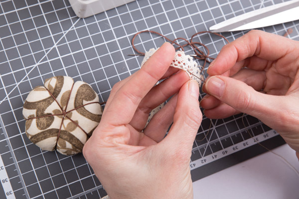 20. Собираем декоративное кружево на нить и стягиваем. Пришиваем пуговицу в середине, одновременно закрепляя кружево.