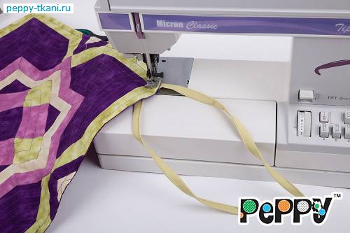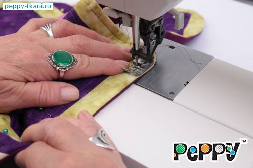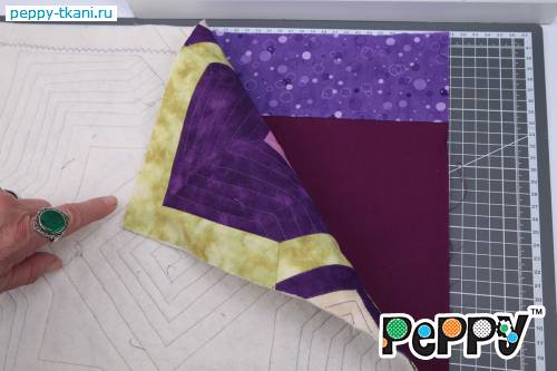 2. Выкроенные детали лоскутного блока и подкладки складываем лицевыми сторонами друг к другу, совмещаем по сторонам и скалываем. Предварительно готовый лоскутный блок «PEPPY», арт.: PLW-0107 простегиваем по линиям узора вместе со слоем хлопкового утеплителя «Warmtex».