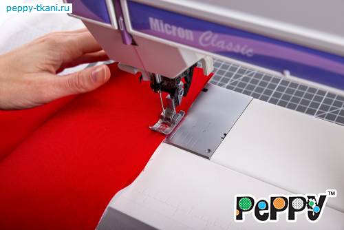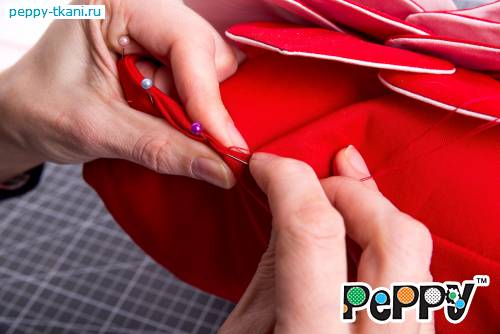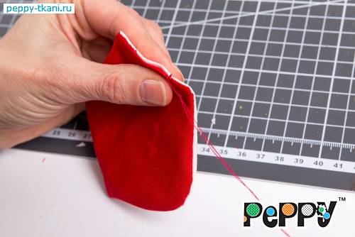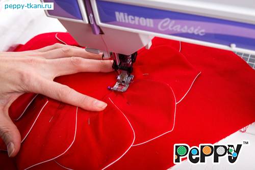 4. Сложим детали лепестков попарно из красной и белой ткани лицевыми сторонами внутрь. Стачаем на машинке «Micron classic», оставив незашитым участок для выворачивания.