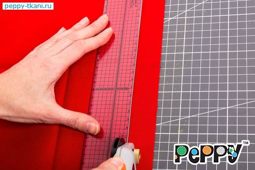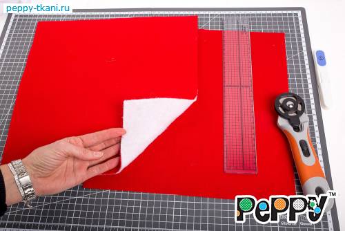7. Для подушки при помощи универсальной линейки «Gamma», арт. RM-001 и раскройного ножа «Gamma», арт. DKP-045, выкроим из красной ткани «Peppy» два квадрата размером 32х32 сантиметра и один квадрат из утеплителя «Warmtex» Fusible Warm Fleece такого же размера. Одну из деталей приклеиваем к утеплителю, для этого сбрызнем водой утеплитель со стороны клеевого покрытия, наложим на него красный квадрат и приутюжим.