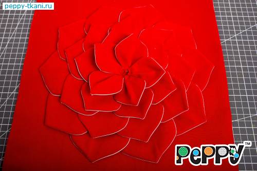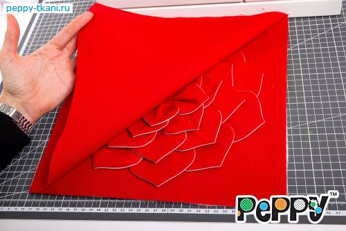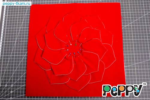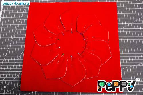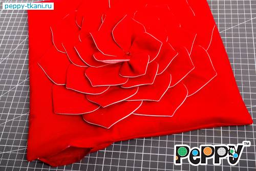 12. Накроем деталь с цветком вторым квадратом из красной ткани. Выровняем по углам и соединим булавками две детали подушки.