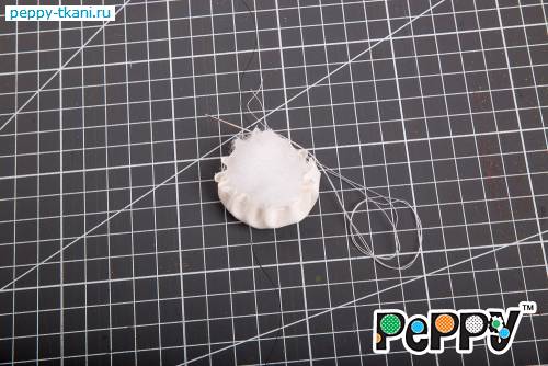 Из светлой ткани вырежем круг диаметром шесть сантиметров. Проложим вручную наметочную строчку по краю, в середину положим немного синтепона. Стянем нитку и закрепим. Пришьем шарик в середину цветка.