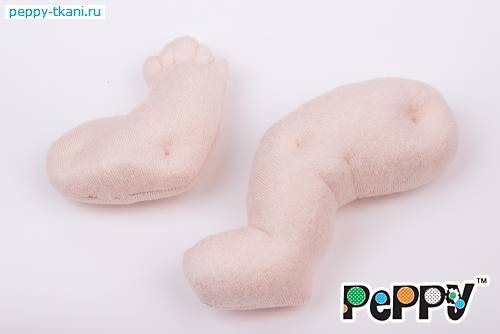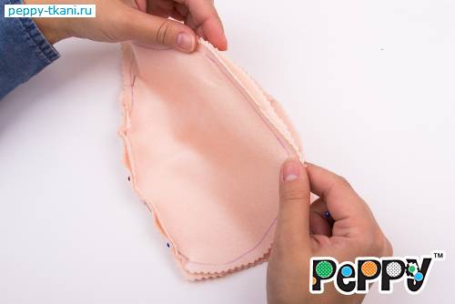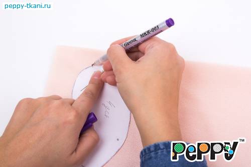 1. Ручки и ножки куклы выполняются по аналогии друг с другом. Рассмотрим процесс изготовления на примере одной детали. Переведем выкройку на сложенную вдвое изнаночную сторону розовой ткани «PEPPY» CRAFT VELOUR  при помощи самоисчезающего маркера с корректором «Gamma», арт.: MKR-001.