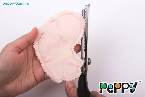 2. Стачаем по контуру на швейной машинке «Micron classic», арт.: 1035, оставив отверстие длиной три сантиметра для набивки. Проследим, чтобы отверстие оказалось сзади. Вырежем деталь по контуру с помощью ножниц «зиг-заг» «Gamma», арт.:  G-ZG -1.