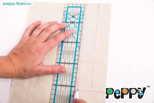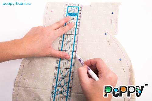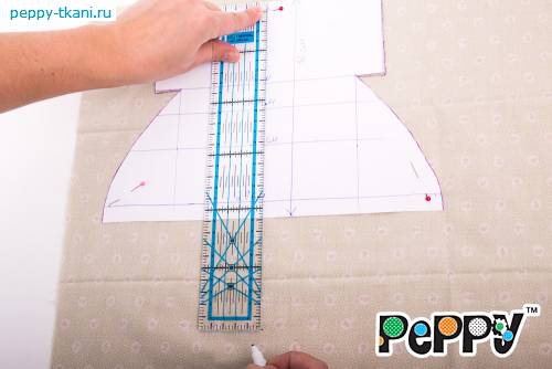 Для комбинезона с помощью линейки «GAMMA», арт.: QRL-02, отложим от линии плеч вниз 30 сантиметров. Сделаем маркером отметку на ткани и проведем горизонтальную линию, определяющую длину изделия. Продлим боковые стороны вниз до этой линии. Соединим булавками два слоя ткани между собой и вырежем деталь по контуру, оставив припуски в один сантиметр.