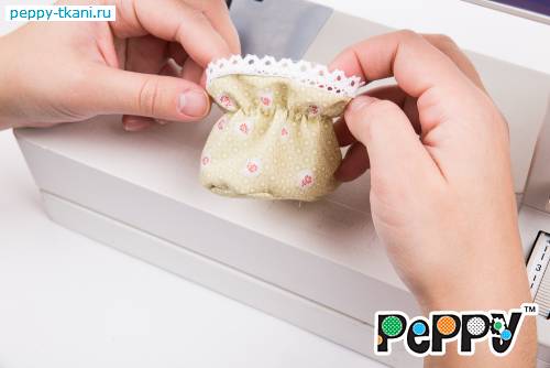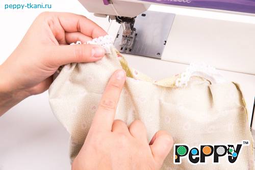 22. Проложим строчку по краю, отступив от кружева 2,5 сантиметра. Верхний край пинетки красиво присборится.