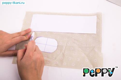 2. Расположим на ткани выкройку так, чтобы линия плеч совпала с  соединительным швом. Обведем контур выкройки с помощью самоисчезающего маркера.