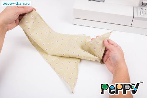 23. Для косынки выкроим из ткани квадрат размером 50*50 сантиметров и разрежем его пополам. Подогнем все края на 0,5 сантиметров и прострочим на машинке.