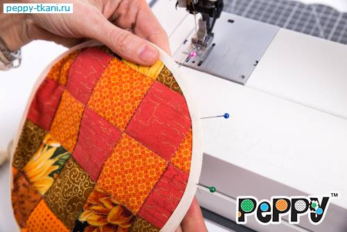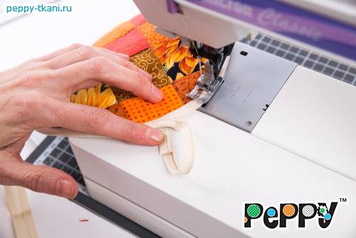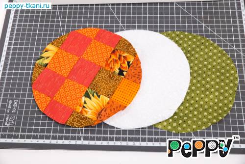 1. По размерам готового лоскутного блока выкроим две детали из утеплителя «Warmtex» и ткани «Peppy» для обратной стороны. Сложим вместе все три слоя, расположив утеплитель между лоскутным блоком и подкладкой.